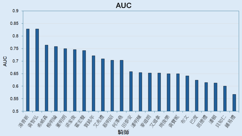 跟著我們以不同騎師的預測結果去分別計算 AUC ,原來真的有著明顯分別,所有結果於以下資料表列出(以AUC由高至低排序):